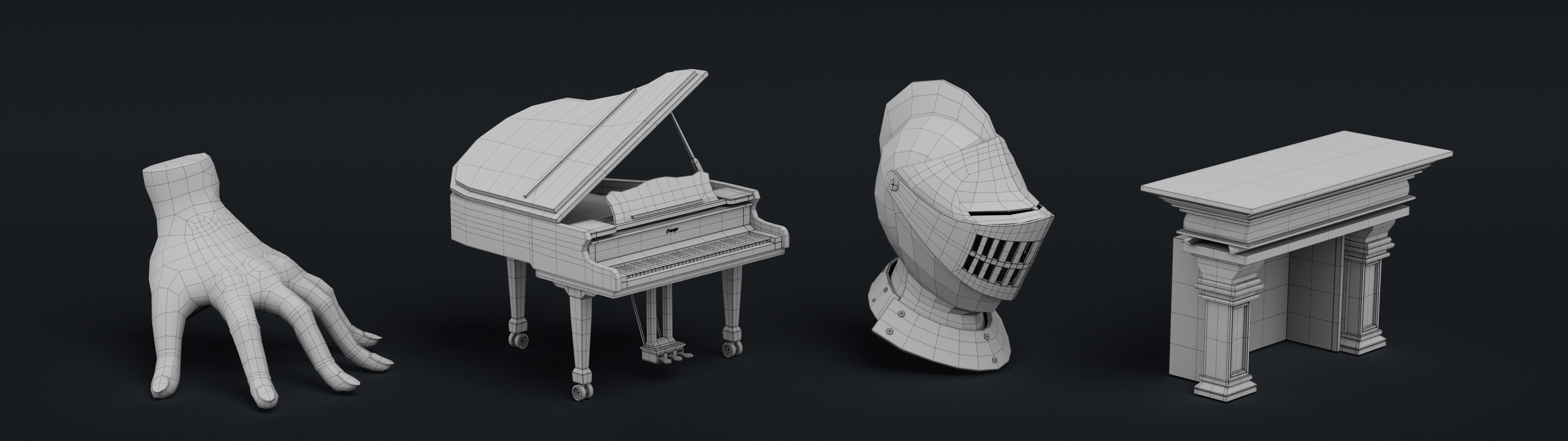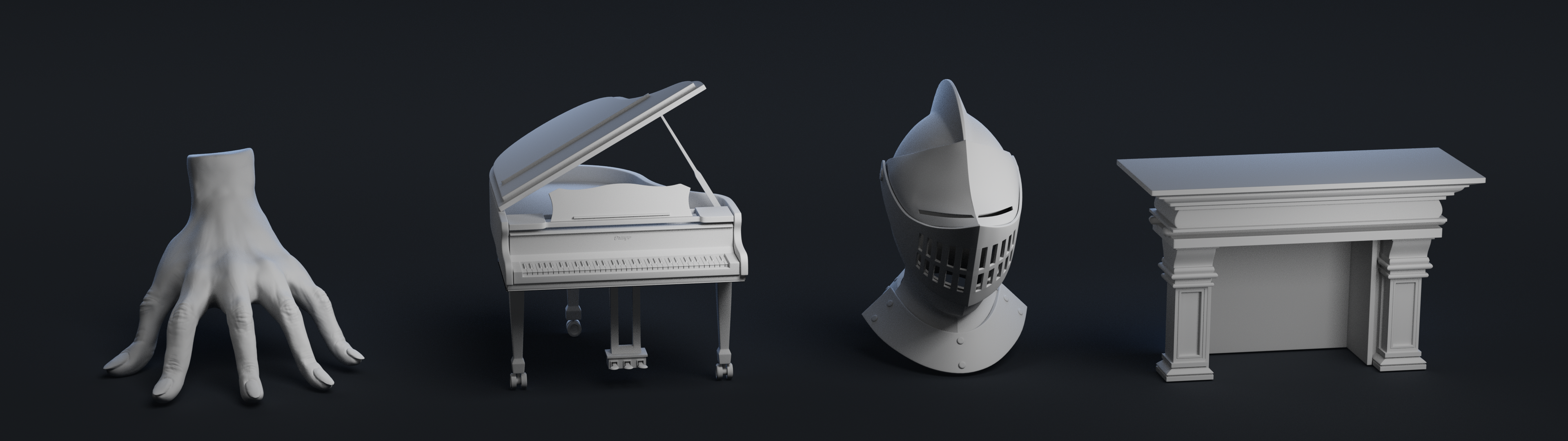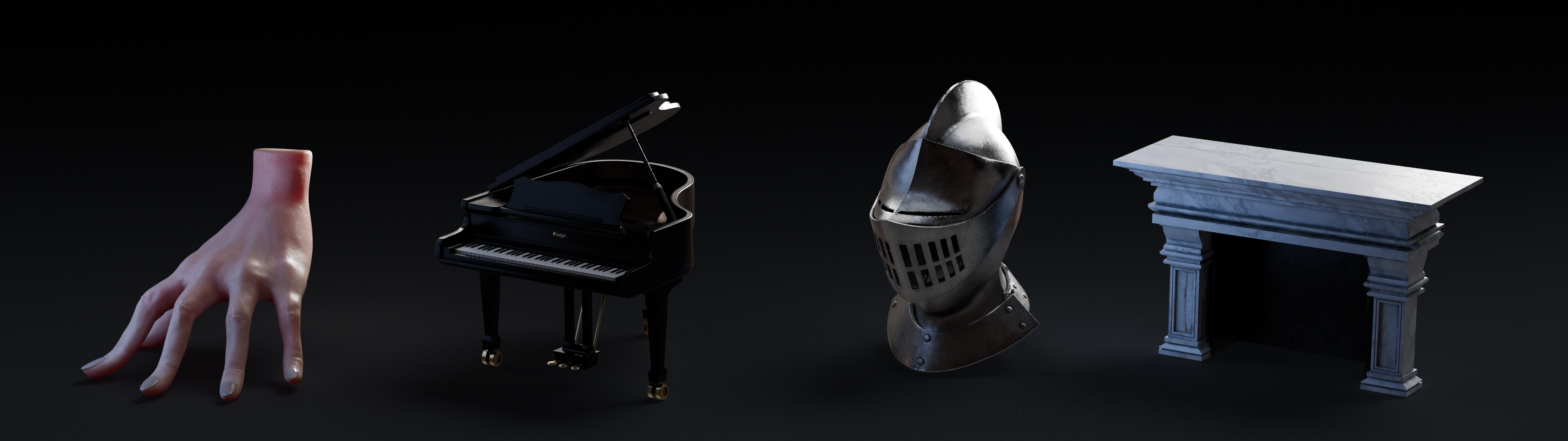 Modeled hand, piano, armored helmet, and fireplace using Maya, with the hand sculpted in ZBrush. Textured everything with Substance Painter and rendered the final images with Arnold.
